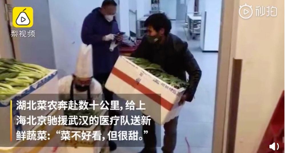 45岁的秦师傅是位菜农,听说援鄂医生在40公里外工作,立马他筹措24箱蔬菜,骑着三轮车边问路边出发,从白天找到夜晚,才找到了医生们住的酒店。