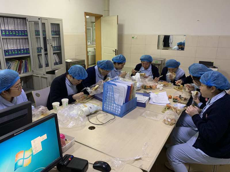 “饭都凉了,吃点饭再忙,快点吧……”内部对讲机里,刘美玉和赵霞两位护士长轮流给隔离病房内喊话,这才有护士取走了挂在特殊通道墙上的午饭,而此时的时间已经下午3点多了。