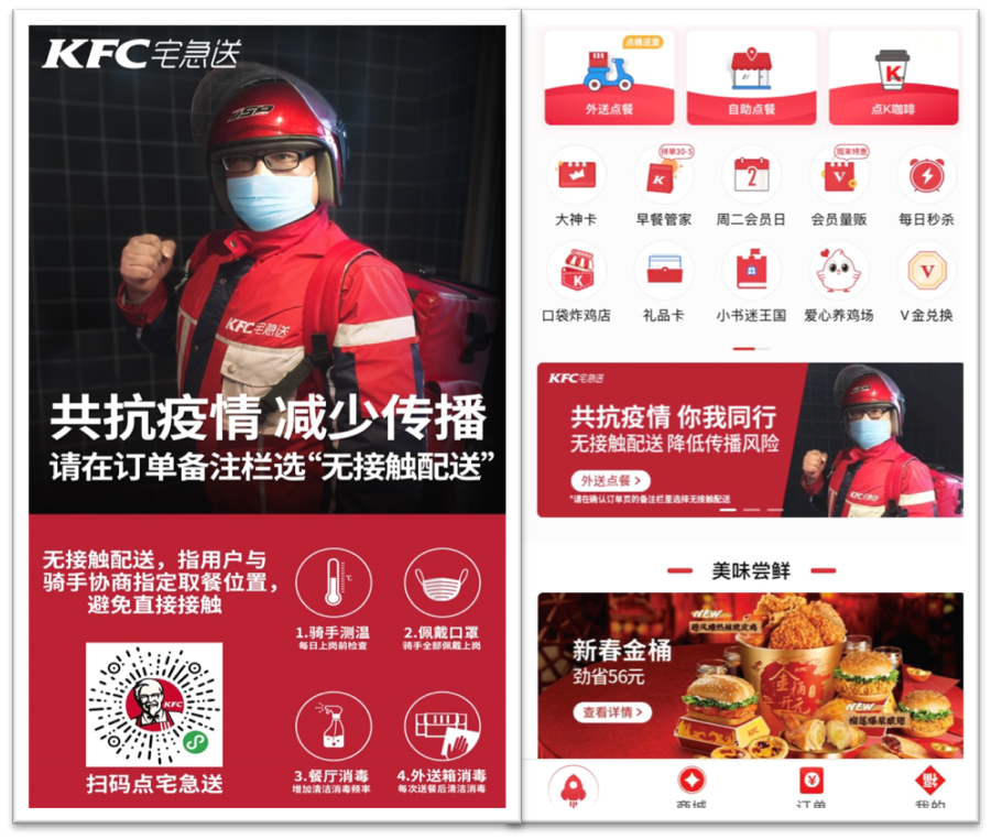 1月 30日起,全国范围内,肯德基宅急送和必胜客宅急送同时推出“无接触”配送服务,肯德基也称为“肯德基安心送”,在订餐时可以通过APP或小程序在线上订单的留言备注功能主动选择“无接触配送”方案。所谓无接触,指消费者与骑手不产生直接接触,双方协商约定将餐品放在指定位置,避免直接取餐,尽可能降低人传人风险。骑手们每次送餐前后都会洗手消毒,在上门配送的时候都将佩戴口罩,且每次送餐后回到餐厅对烫手包进行清洁消毒。