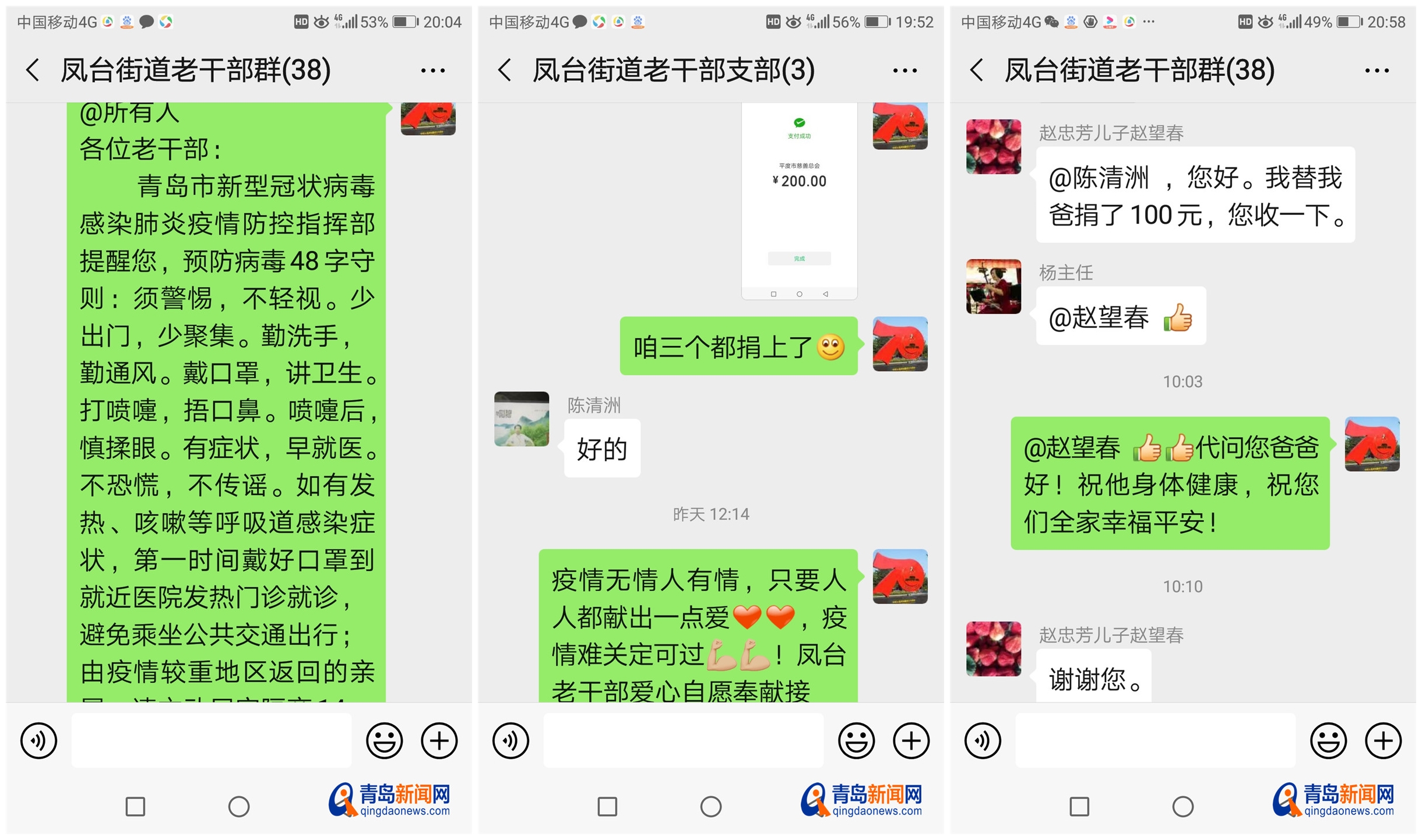 自新型冠状病毒感染的肺炎疫情发生以来,牵挂着每一个凤台人的心,大家都通过不同的形式为防疫工作出一份力。自1月28日凤台街道办事处发出疫情防控捐款倡议后,街道老干部党支部立即召开微信碰头会,决定支部成员3人带头,在凤台机关离退休干部及退休教师群里发动大家网上捐款。