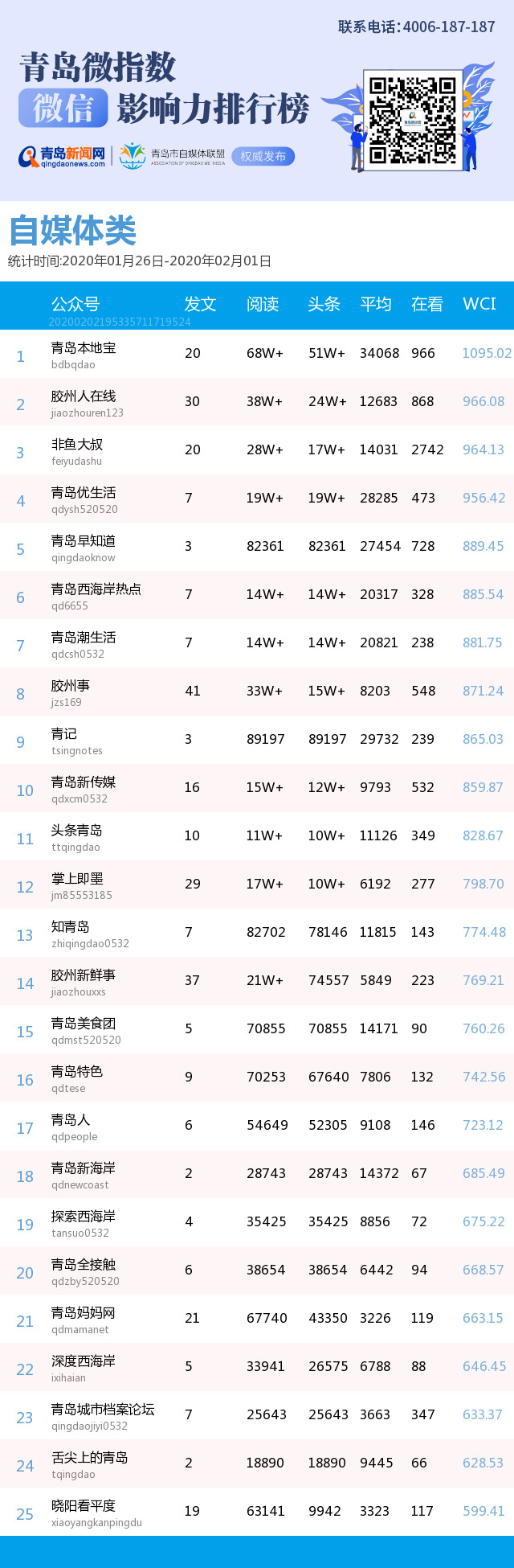 自媒体榜综合排名前三位的是“青岛本地宝”、“胶州人在线”、“非鱼大叔”。在排名变化方面,“胶州人在线”总阅读增加20万+,连升4个名次,拿下本期第2名;“青岛优生活”总阅读增加12万+,由上期第14名升至本期第4名。热文方面,本期自媒体榜收获10万+热文两篇,分别是“青岛本地宝”发布的“紧急通知!山东省内企业不早于2月9日复工!中小学幼儿园不早于2月17日开学~”、“胶州人在线”发布的“胶州市确诊首例新型冠状病毒感染的肺炎病例”。