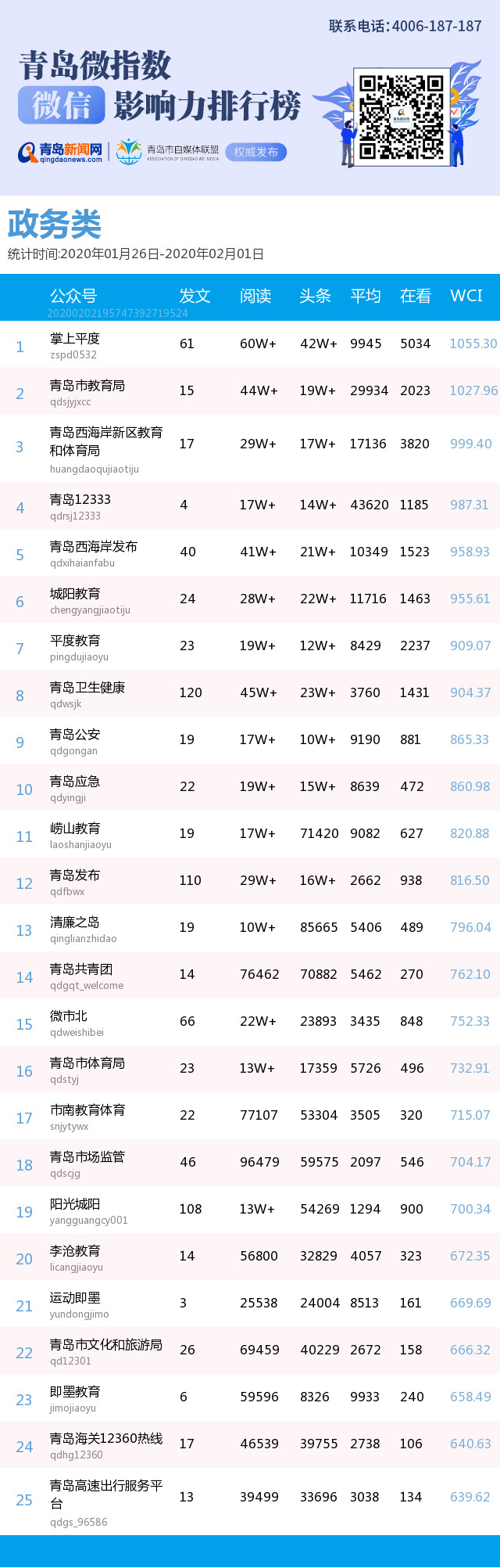 政务榜综合排名前三名的是“掌上平度”、“青岛市教育局”、“青岛西海岸新区教育和体育局”。在排名变化方面,“掌上平度”总阅读增加40万+,连升5个名次,一举拿下本期冠军宝座;“青岛市教育局”总阅读数增加30万+,由上期第8名升至本期第2名。热文方面,“掌上平度”发布的“总理承诺,平度兑现!2万套护目镜从平度空运武汉。”、“平度市新型冠状病毒感染肺炎疫情防控指挥部紧急通知”两篇文章阅读均超10万+,依次占据热文榜第1、第2名;“青岛市体育局”发布的“打赢防疫硬仗!家庭室内运动‘八段锦’让我们练起来”一文,在大家集体宅的时段,一经推出就引发网友关注,截至目前阅读10万+,在看数345次,高举热文榜第3名;“微市北”凭借“【注意】江苏一密切接触者拒绝配合隔离?后果来了!”一文,同样引发关注,以阅读10万+的成绩占据热文榜第4名。