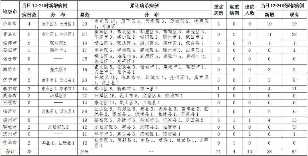 从山东省卫生健康委获悉,2020年2月4日12—24时,山东省报告新型冠状病毒感染的肺炎新增确诊病例23例,累计确诊病例298例(含重症病例21例,危重症病例4例,出院13例,无死亡病例);新增疑似病例38例,现有疑似病例94例。截至目前,追踪到密切接触者10264人,已解除医学观察4058人,诊断为疑似或确诊139例,尚有6067人正在接受医学观察。