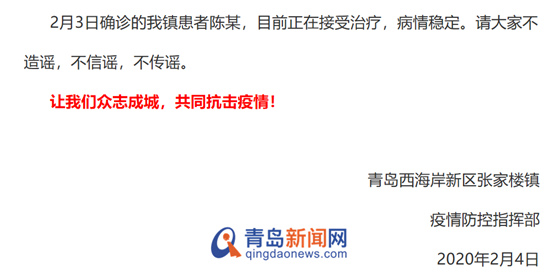 青岛新闻网2月5日讯(记者 丁淑华)日前,有人在网上散播消息称:青岛西海岸新区张家楼镇居民因新型冠状病毒感染的肺炎病故,引发市民恐慌。昨日,张家楼镇人民政府官方微信公众号发布情况说明进行辟谣:2月3日确诊的患者陈某,目前正在接受治疗,病情稳定。请大家不造谣,不信谣,不传谣。