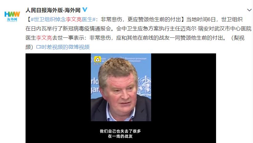 当地时间6日,世卫组织在日内瓦举行了新冠病毒疫情通报会。会中卫生应急方案执行主任迈克尔·瑞安对武汉市中心医院医生李文亮去世一事表示:非常悲伤,应和其他在前线的战友一同赞颂他生前的付出。