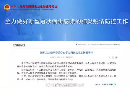武汉市中心医院李文亮医生在抗击疫情中感染新型冠状病毒肺炎,经全力救治不幸逝世,国家卫健委表示深切哀悼,向李文亮医生的家属表示诚挚慰问。