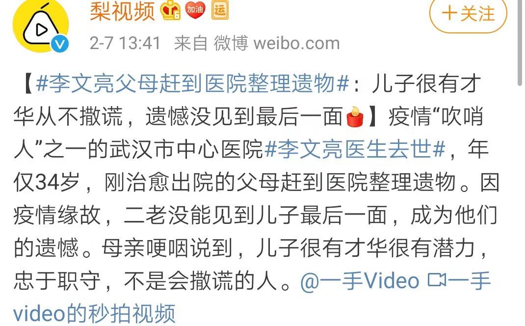 医生在传染病爆发的时候就是战士,医院就是战场,李文亮的因公殉职英勇、朴实,尤其让人心痛。