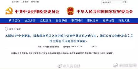 经中央批准,国家监察委员会决定派出调查组赴湖北省武汉市,就群众反映的涉及李文亮医生的有关问题作全面调查。