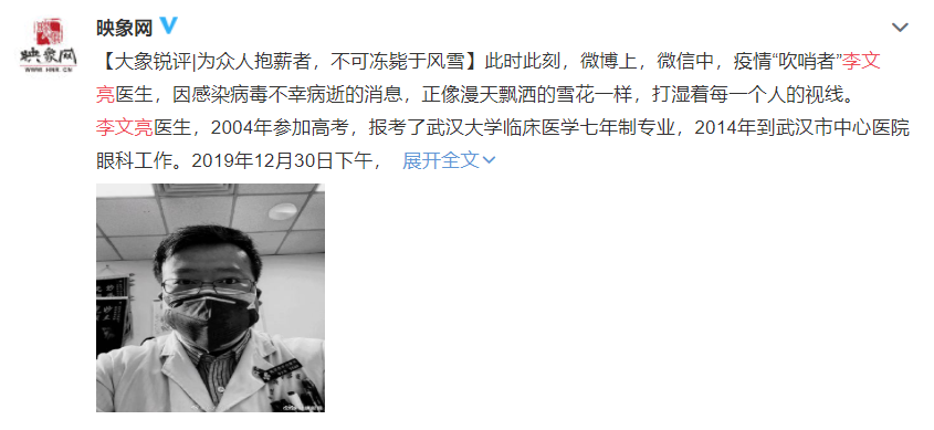 此时此刻,微博上,微信中,疫情“吹哨者”李文亮医生,因感染病毒不幸病逝的消息,正像漫天飘洒的雪花一样,打湿着每一个人的视线。