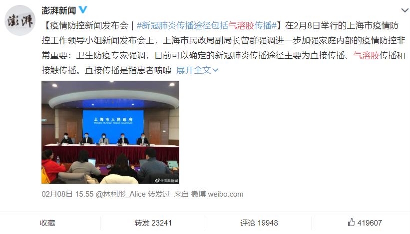 2月8日,上海市政府举行疫情防控新闻发布会。在发布会上,卫生防疫专家表示,新型冠状病毒感染的肺炎传播途径主要为直接传播、气溶胶传播和接触传播。气溶胶传播是指飞沫混合在空气中,形成气溶胶,吸入后导致感染。