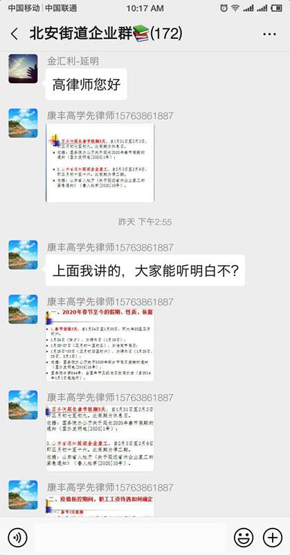 2月9日下午,青岛市即墨区北安街道企业微信群里所有人突然被点名,一条“下午2:30,群内开展‘线上普法大讲堂’宣讲”的通知,让群里突然热闹起来,该街道邀请律师进“群”授课,为中小企业在线答疑,切实保障企业家合法权益。