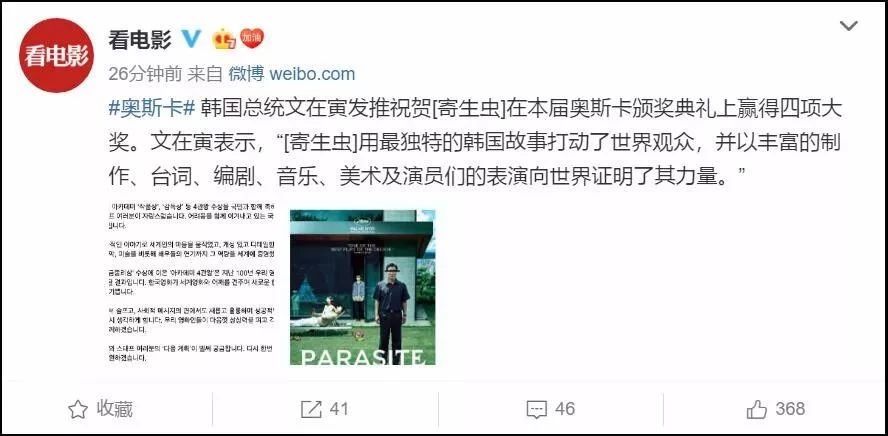 韩国总统文在寅也特地发文恭喜了[寄生虫],还说今后会进一步为广大韩国影人提供能够尽情发挥想象力并大胆创作电影的环境。我们真是只有光羡慕的份了……