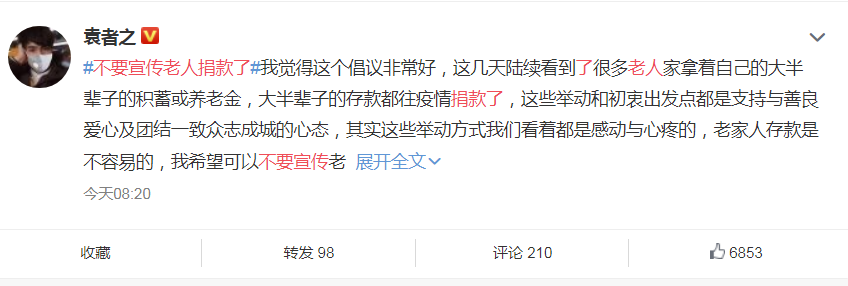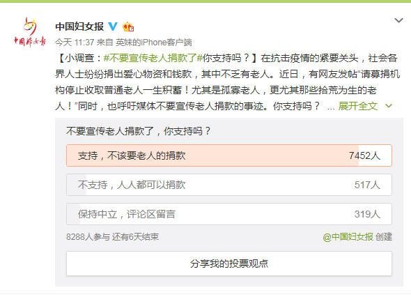 一位老人找到工作人员,放下一个包裹就匆忙离开,等到大家反应过来,老人的背影已经消失。工作人员打开包裹,才发现里面有两万元钱,还有一张纸条:“请帮我捐给一线的战士,谢谢他们。”无名的老人,沉甸甸的捐款,动人的场景,这样的画面,真的让人泪目。疫情爆发以来,各地都出现了民众自发捐款捐物的感人事迹。在众多捐助模式中,也出现了一种比较典型的类型:老人捐款。据记者站公号不完整统计,十几天来,很多地方都出现了老人捐款的新闻,并且呈现出越来越多的态势。梳理一下会发现,这些新闻都有类似的几个特点:1,捐款者都是年龄很大的老人,生活条件都不好,甚至还有残疾人;4,所捐钱数有越来越大额的趋势,从一万,两万,五万,十万,现在最多的已经到了20万;5,工作人员往往联系不到本人,或者就是本人不听劝阻,执意捐款。而检索新闻内容还可以发现,这些捐款大概会有几个去向:捐给慈善总会,或者存入当地政府财政非税专户,用于抗击疫情。这些老人把仅有的积蓄都拿出来,心存大爱,让人非常动容,媒体也有充分的理由来报道这样的人物和事情。另一方面,新闻报道在客观上起到了一定的示范作用。今天,有微博大V就发出了倡议,“请募捐机构停止收取普通老人一生积蓄!尤其是孤寡老人,更尤其那些拾荒为生的老人!他们的钱一分都不能要。”不少网友也发出倡议:请媒体不要再宣传老人捐款了。网友的态度很明确:老人都是看到了一线的报道之后,完全出于善良的本能来捐款,并没有为自己考虑太多,而他们捐出来的都是毕生积蓄,都是养老钱,这等于把自己放到了一个没有退路的境地。一旦自己发生了紧急情况,可能连自己的生活都无法保证。很多网友一方面呼吁媒体不要再宣传老人捐款了,一方面也希望有关单位能考虑到老人的实际情况,不要收取老人的捐款,或者只收取一部分作为心意。毕竟,这些老人的生活保障,同样重要。谁都不希望在收到一份捐款之后,身边又多一个生活无着的老人,这份责任,谁能背负?中国妇女报微博也就这个话题发布了调查,绝大多数网友都认为不该要老人的捐款。对于媒体来说,报道感人事迹是分内工作,这一点无可指责。但是对于老人这个群体,如何让他们在理解疫情、了解一线故事、做好自我防护的基础上,最大限度做好自我保障,而不是不顾一切地拿出所有身家,给自己晚年带来隐患,才是更重要的事情。