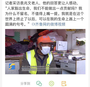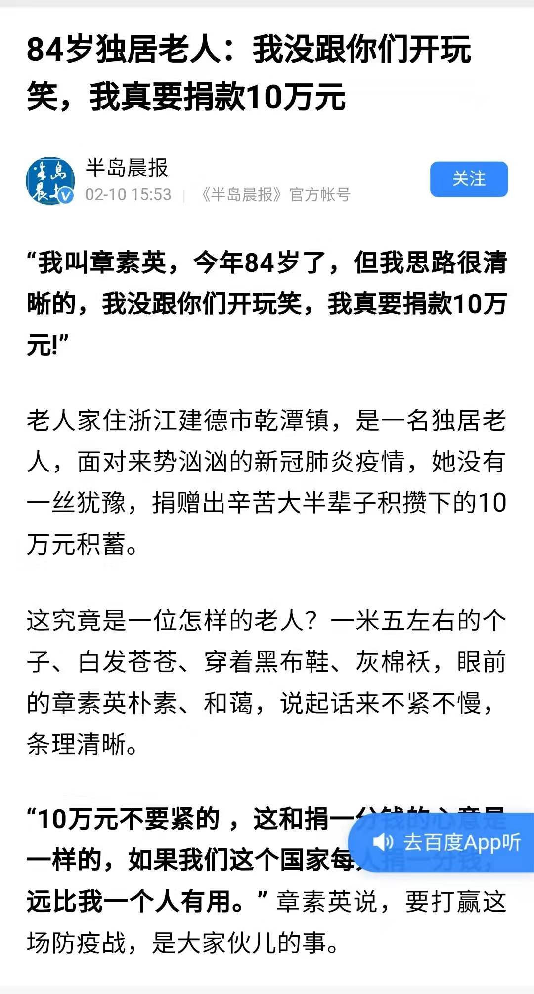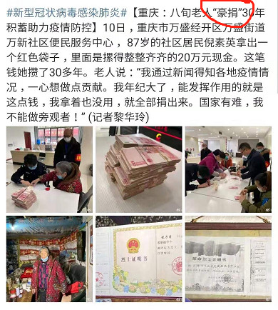 这件事里,包括老人、媒体、相关单位,所有人都是好心,但是好心有时候也会带来不必要的麻烦。特别是像上图这种“豪捐”的鼓励性提法,实在是值得商榷。老人捐款的新闻,真的就别报了。还应该劝劝老人们,自己的晚年同样重要。真正做到以人为本,这是体现媒体报道人文关的怀题中应有之义。毕竟,相对于那些捐款的老人,那些连口罩都不肯戴的老人,更应该受到媒体的引导和教育。