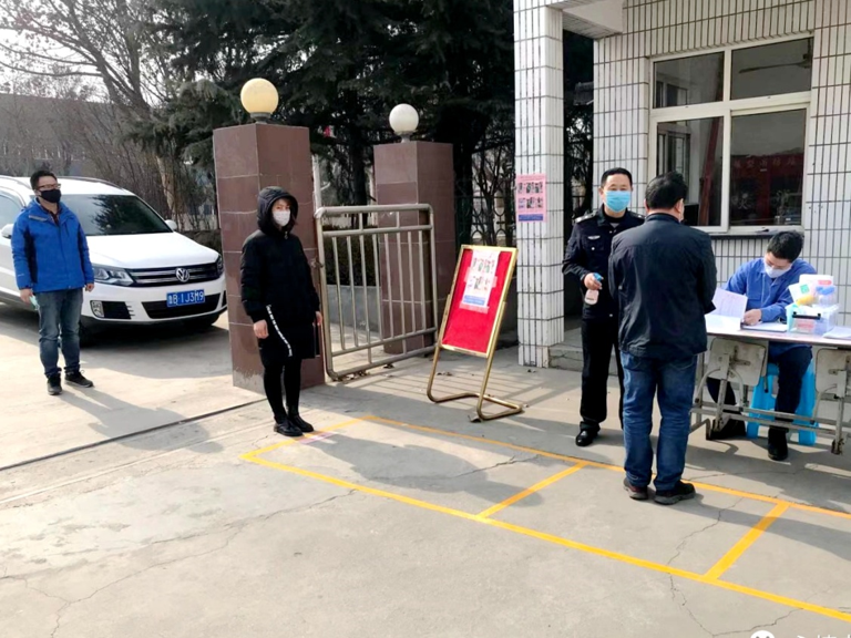 年后复工第一天,环秀街道青岛金王应用化学股份有限公司车间门口,工作人员拦下每一个准备进入车间的人员进行测量体温和详细登记。