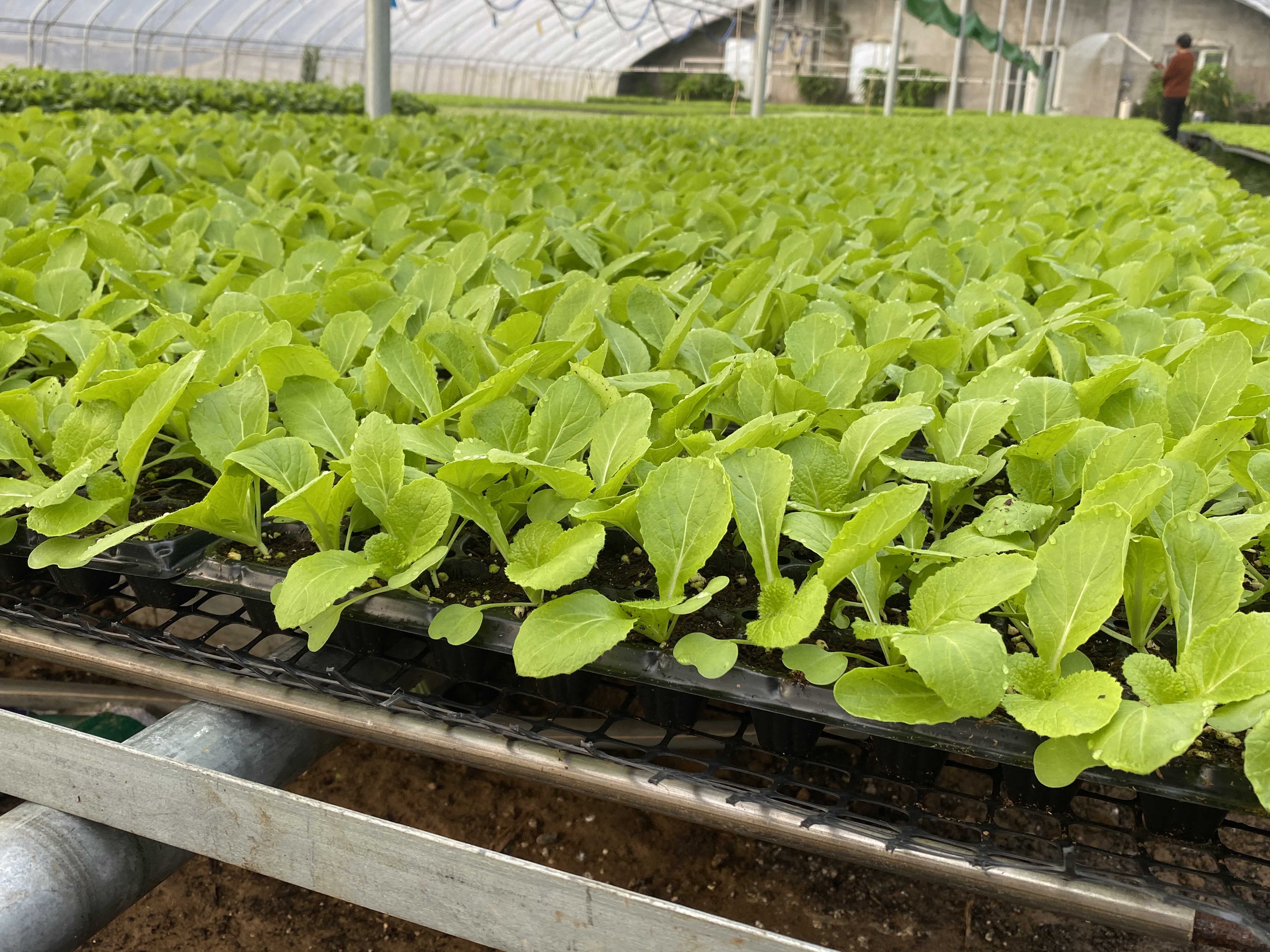西红柿、白菜、甘蓝等幼苗铺满了苗床,长势喜人。合作社育苗温室里,一片生机勃勃,绿意盎然的景象。