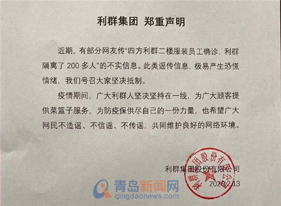 青岛新闻网2月13日讯(记者 丁淑华)近期,有部分网友传播“四方利群二楼服装员工确诊,利群隔离了200多人”。今日,利群集团官方进行辟谣,此消息不属实,并表示,疫情期间广大利群人坚决坚持在一线,为顾客提供菜篮子服务,为防疫保供尽自己的一份力量。青岛网警再次提醒广大网民:值此防控疫情的关键阶段,望广大网民众志成城,共克时艰,切勿盲目转发未经核实的疫情信息,不造谣、不信谣、不传谣,共同维护良好的网络环境。