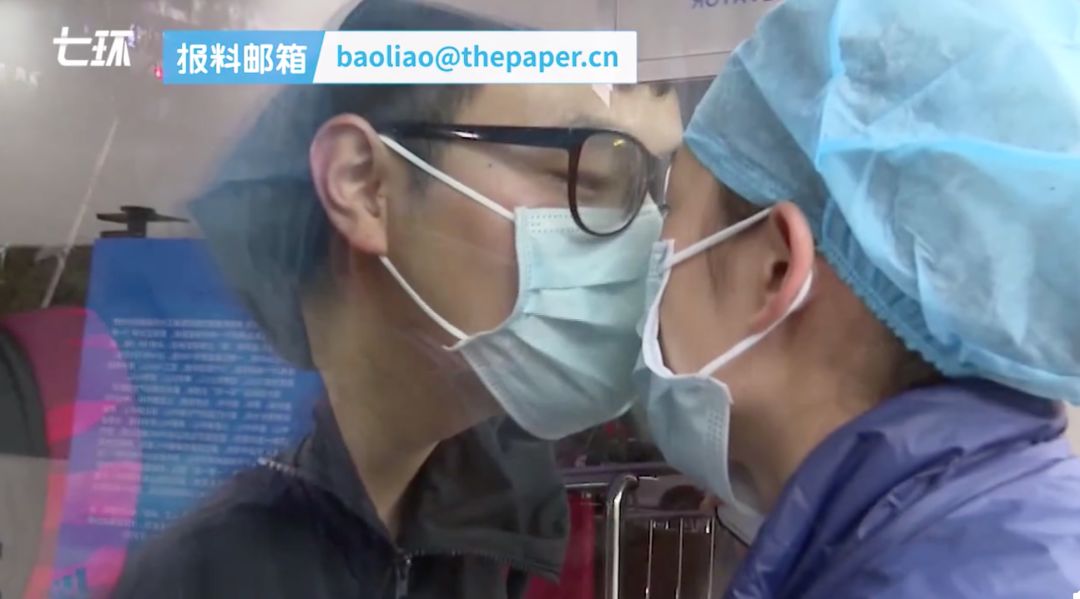 同一天晚上,在绍兴市人民医院,一对医护夫妻在隔离病房前偶遇。