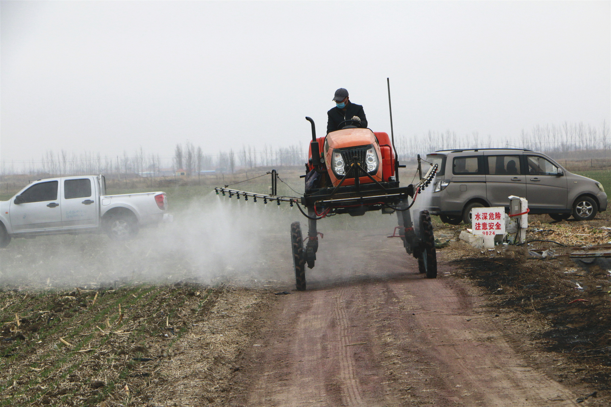 图:正在对机耕路进行防疫消毒工作