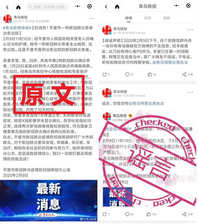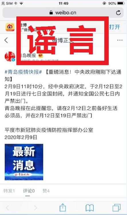 2月15日,记者从青岛市公安局网警支队获悉,2月9日,一张伪造青岛晚报发布的内容为“2月9日起进行七日全国封闭”的微博图片在网上广泛传播。当晚,青岛晚报进行辟谣。