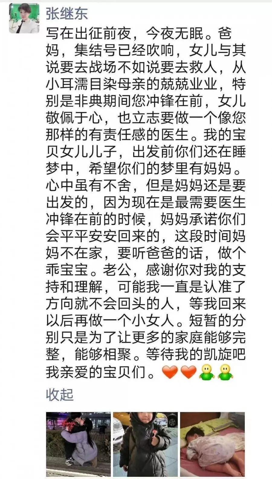 “写在出征前夜,今夜无眠。爸妈,集结号已经吹响,从小耳濡目染母亲的兢兢业业,特别是非典期间您冲锋在前,女儿敬佩于心,也立志要做一个像您那样的有责任感的医生┅┅”这是张继东在出征武汉前发在朋友圈中的一段话,印证着医者最美逆行的传承。