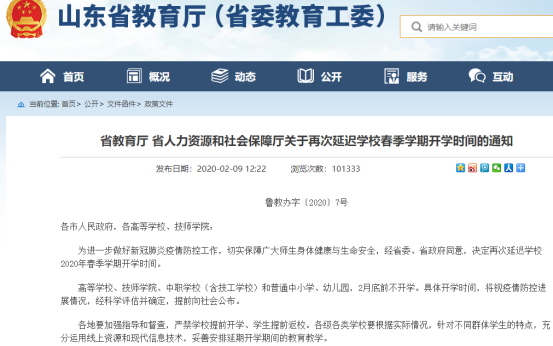 根据山东省教育厅、人力资源和社会保障厅《关于再次延迟学校春季学期开学时间的通知》,高等学校、技师学院、中职学校(含技工学校)和普通中小学、幼儿园,2月底前不开学。具体开学时间,将视疫情防控进展情况,经科学评估并确定后再行公布。