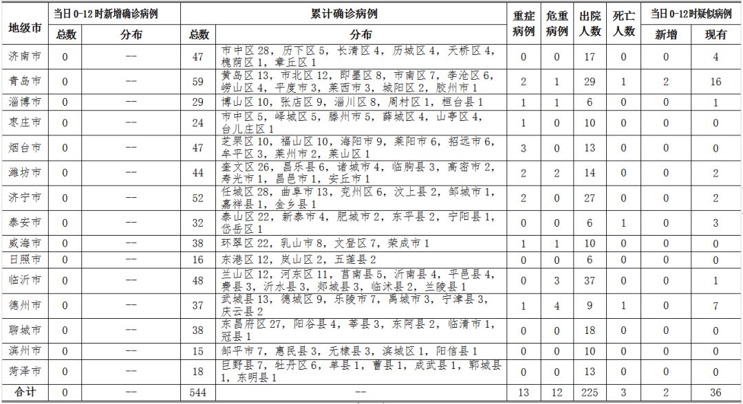 2020年2月19日0-12时,山东省无新增新型冠状病毒肺炎确诊病例,累计确诊病例544例(含重症病例13例,危重症病例12例,治愈出院225例,死亡病例3例);新增疑似病例2例,现有疑似病例36例。截至目前,追踪到密切接触者16126人,已解除医学观察13403人,诊断为疑似或确诊病例291例,尚有2432人正在接受医学观察。
