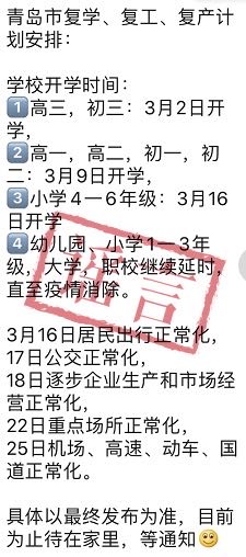 辟谣:网传“青岛市学校复学时间安排”不属实