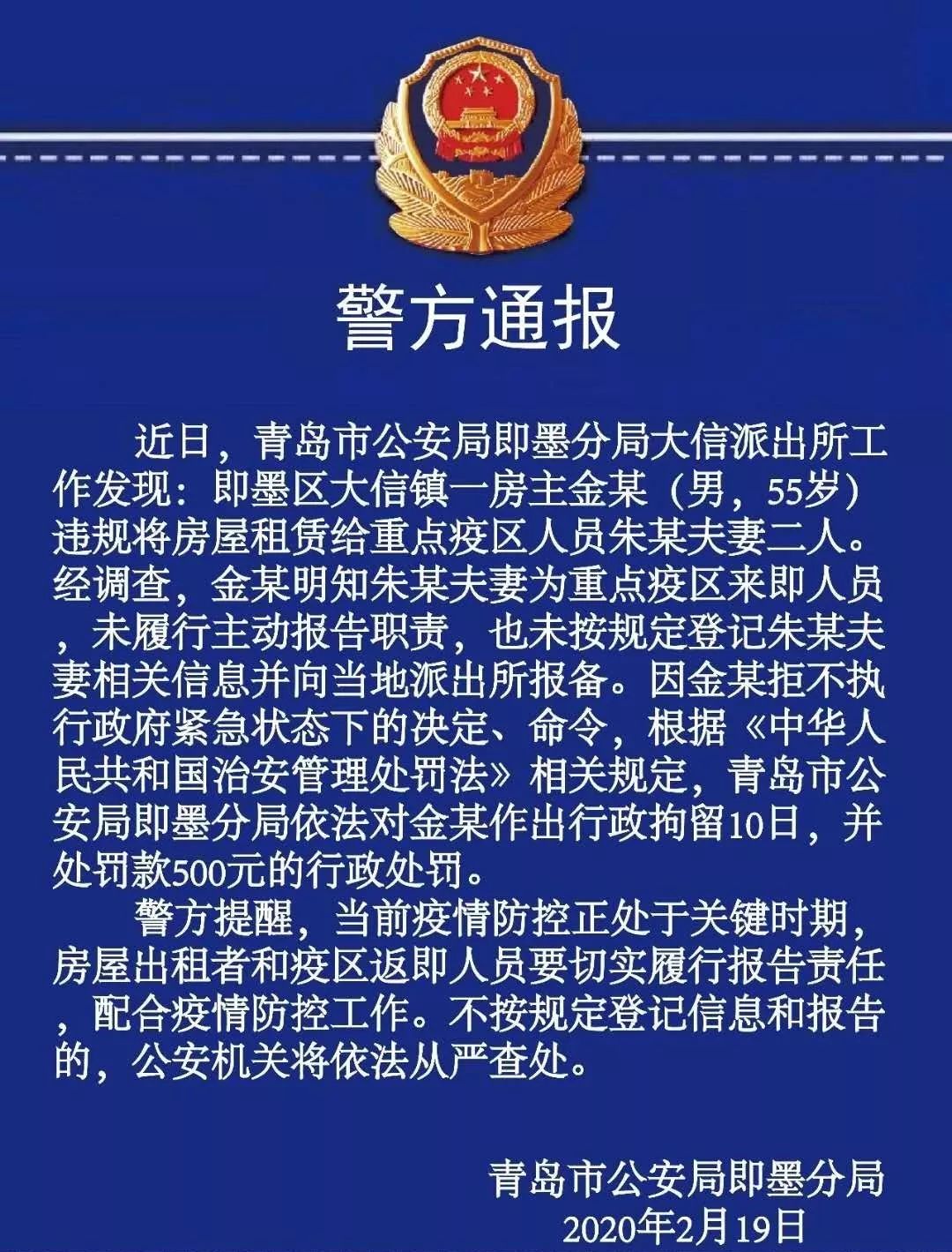 对疫区承租人员隐瞒不报,即墨一房主被拘留