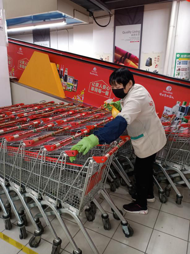 街道大型超市入口设置防疫检查岗,配齐测温仪、登记表、消毒液等设施,安排专职工作人员,对进入超市顾客进行测温、消毒,对未佩戴口罩的顾客进行提醒和劝返,体温超过37度的及时按照程序采取相应措施,从源头上防止病毒传播。超市坚持“专人负责,全员参与”的工作思路,对超市收银台、电梯间、门把手等各个角落进行不定时循环消杀,定时做好超市内部区域通风换气,保证室内空气清新。
