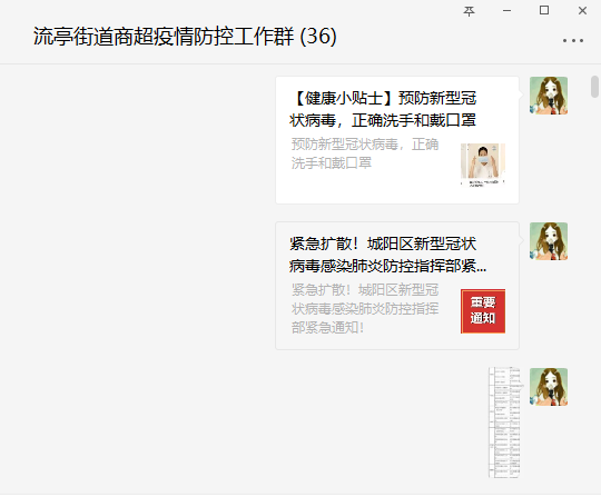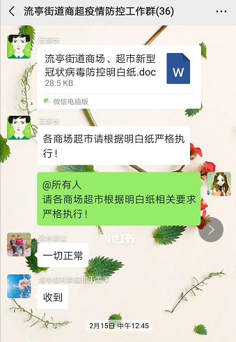 在疫情出现的第一时间,街道商务商贸科就建立了“流亭街道商超疫情防控工作群”,全面摸排商场超市的外来返青人员,加强人员管理并及时上报。同时,将正确佩戴口罩、正确洗手、正确消杀等健康小知识和知识手册在微信群里进行宣传,提高商场、超市的防控意识。