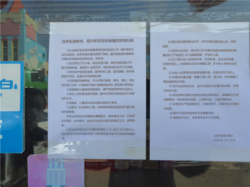 前期,流亭街道根据商场、超市的实际经营情况,对经营场所消杀、顾客出入、员工管理等方面严格要求,发放了《流亭街道商场、超市新型冠状病毒防控明白纸》,制定了《流亭街道商场、超市继续经营工作方案》。
