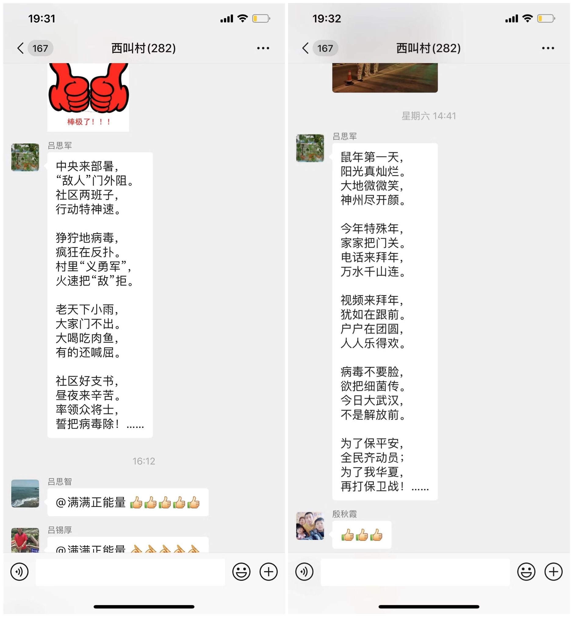 “你们辛苦了!这几天在村路口啊天天看到你们的身影,有你们在,我们放心!”写完第一首,吕思军马不停蹄的又开始创作第二首、第三首。如今,打油诗在社区村庄中广为传唱,群众们都在为没日没夜守在疫情防控一线的工作人员点赞、加油!也正是有了各行各业在疫情面前依旧牵挂着工作人员的普通群众,看似微小却包含着大爱的举动,让坚守岗位的人员心里很暖,能得到群众认可,让他们的付出也有了回报。