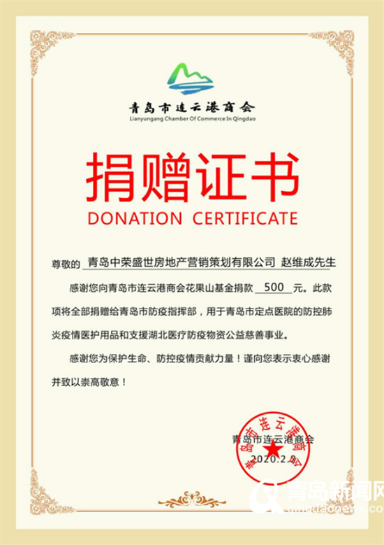 青岛新闻网2月22日讯(记者 丁淑华)连续一周来,青岛中荣盛世房地产营销策划有限公司董事长、青岛市连云港商会副会长赵维城一直奔波在路上,他连续向青岛市南香港中路街道办事处、市北区辽宁路街道办事处、青岛市北即墨路街道办事处、青岛李沧区李村街道办事处南山社区、青岛市北交警大队以及青岛浮山派出所等六单位的一线工作人员,送去了500余顶阻挡飞沫抗击疫情的防护帽。他的到来,让一线工作人员得到更加安全地防护。因此,六家单位也纷纷向其赠送了锦旗表示感谢!