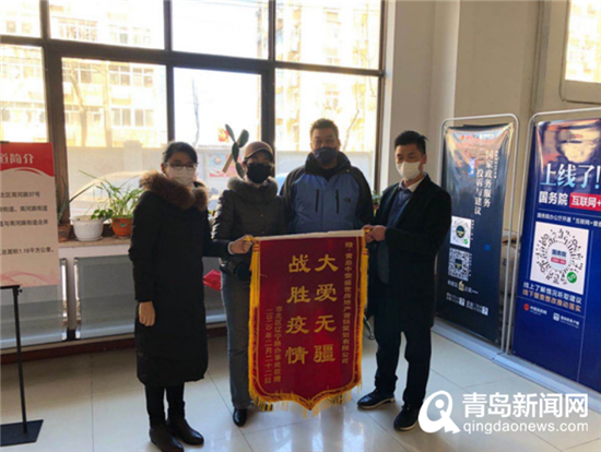 即墨路街道办事处工作人员将一幅绣有“众志成城携手战疫”的锦旗送到赵维城董事长的手中,同时向他表示感谢。