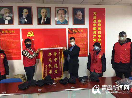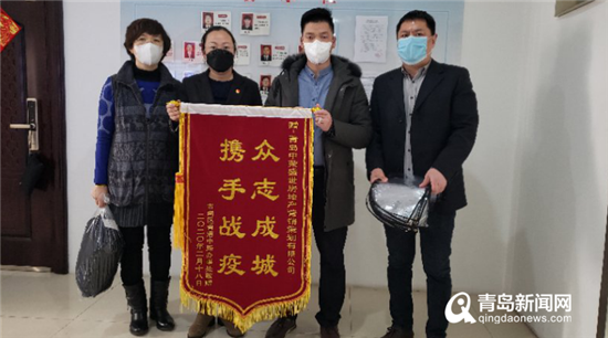 17日上午,在青岛市李沧区李村街道南山社区的会议室里,社区党委书记王伟将一幅绣有“雪中送炭共同抗疫”的锦旗,送到青岛中荣盛世房地产营销策划有限公司董事长赵维城手中。他们捐赠的战疫防护帽,为社区志愿者挡起了一道更加安全的防疫屏障。
