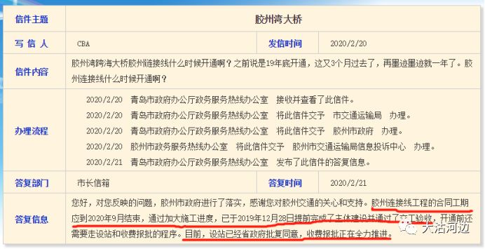 网友“CBA”2月20日在市长信箱咨询:胶州湾跨海大桥胶州链接线什么时候开通啊?之前说是19年底开通,这又3个月过去了,再墨迹墨迹就一年了。胶州连接线什么时候开通啊?