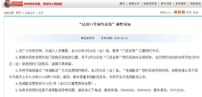 22日,青岛政务网发布民用口罩预约系统”调整须知,为减少人员集聚,自2020年2月24日(含)起,暂停“门店自取”口罩预约方式。