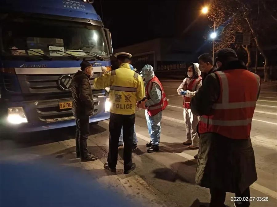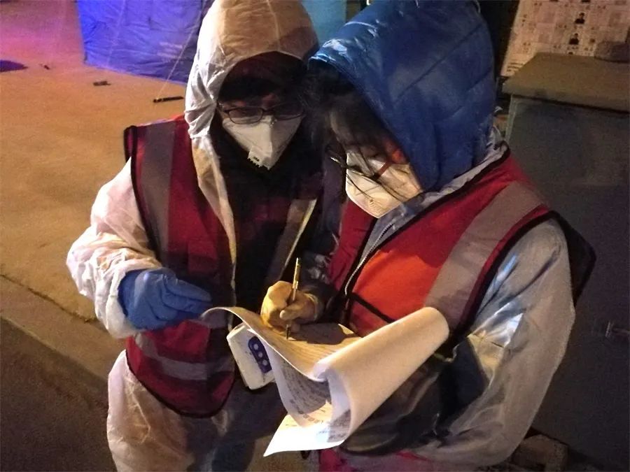 深夜11点正是人们刚刚进入梦乡的好时候,多想再睡一会儿啊!然而铃声就是命令,铃声就是冲锋号。大家匆忙穿好防护服,检查带好设施,冲进漆黑的夜幕,提前赶到阻疫检查卡口站,与区卫健局、公安分局、交警大队的同志们汇合后,便投入到紧张的“战斗”中。