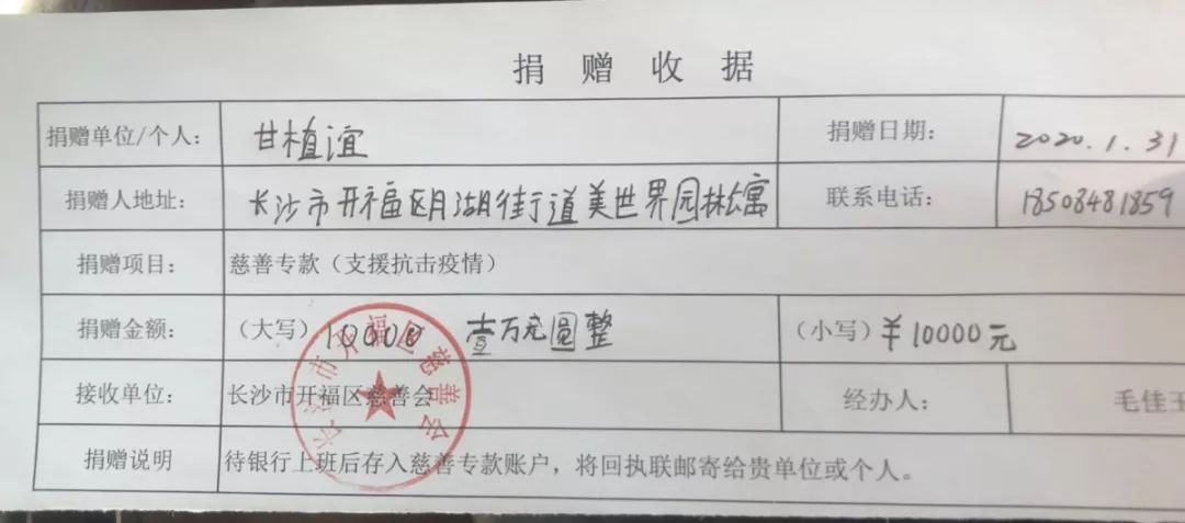 1月31日,湖南安全技术职业学院建安1902班的甘植谊同学来到长沙市朝阳社区居委会,在工作人员的帮助下,将10000元钱压岁钱全部捐给了开福区慈善会,用于支援抗击疫情。
