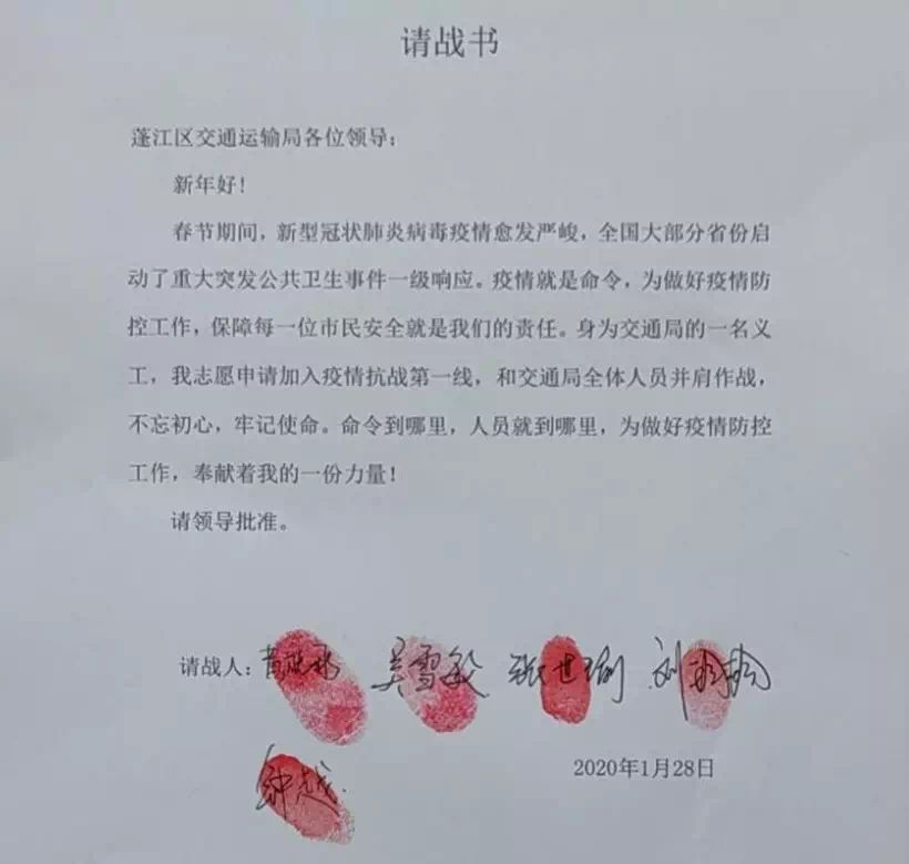据钟越介绍,“1月10日开始,我们本来是作为义工协助交通运输局进行春运工作。疫情爆发后,考虑到我们的个人安全,局里便让我们先休息几天。但想到他们人手不太够,我们想为他们帮忙,于是我们便开始撰写请愿,在28号向他们递交了这份‘请战书’,并开始上岗。