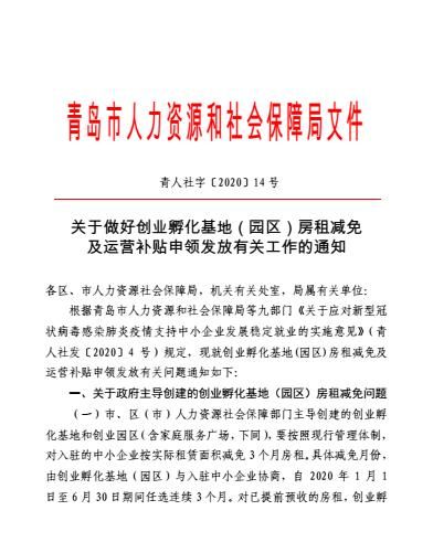近日,青岛市人力资源和社会保障局会同青岛市财政局等部门先后下发《关于应对新型冠状病毒感染肺炎疫情支持中小企业发展稳定就业的实施意见》、《关于做好创业孵化基地(园区)房租减免及运营补贴申领发放有关工作的通知》,对政府主导创建的创业孵化基地、创业园区(含家庭服务广场,同下)入驻的中小企业,按实际租赁面积减免3个月房租。
