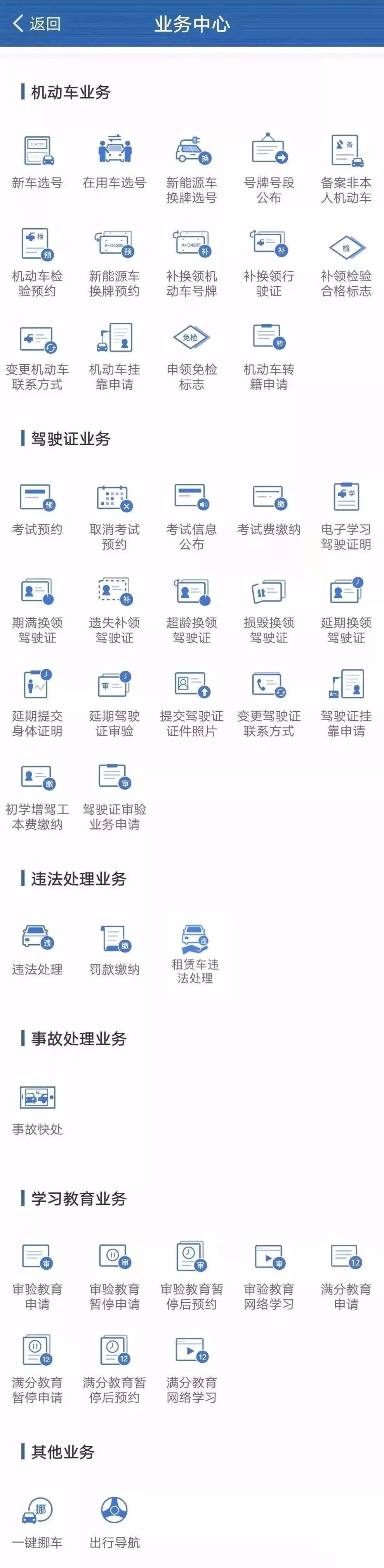 :机动车选号、补换领机动车号牌、补换领机动车行驶证、补领机动车检验合格标志、申领免检标志、提交驾驶证照片、期满换证、损毁换证、遗失补证、超龄换证、考试预约、取消考试预约、考试费缴纳、延期换证、延期审验、延期提交身体条件证明、交通违法处理、罚款缴纳、事故快处、一键挪车、备案非本人机动车等。3、