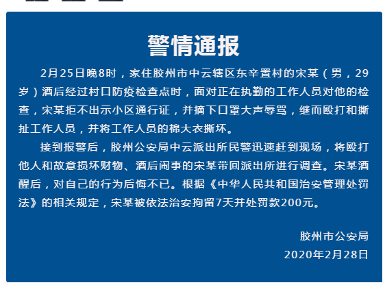 胶州男子不配合防疫检查,殴打撕扯工作人员被拘留