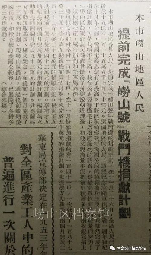 1951年2月,崂山地区在抗美援朝运动中,捐献人民币(旧币)1.66亿元,提前完成捐献“崂山号”战斗机1架的任务。