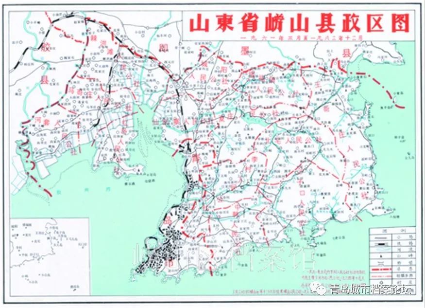 1961年10月5日,国务院113次会议决定设立崂山县,辖李村、惜福镇、王哥庄、夏庄、仙家寨、北宅、中韩、沙子口、棘洪滩、城阳、马哥庄、河套、红岛13处人民公社。