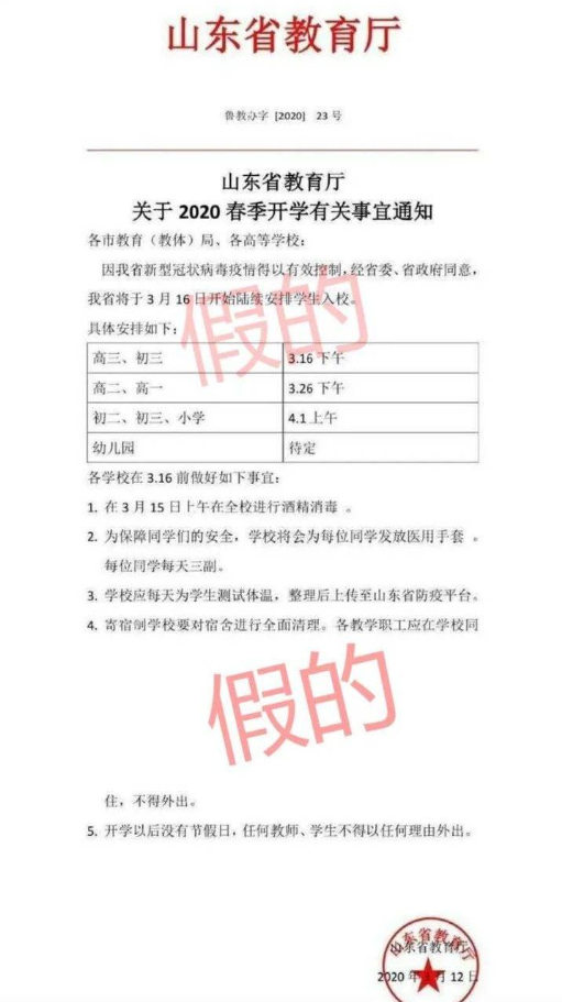 据山东省教育厅消息,近日网传“山东省教育厅关于2020春季开学有关事宜通知”系谣言。