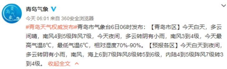 【青岛市区】今天白天,多云间晴,南风4到5级阵风7级,今天夜间,多云转阴有小雨,南风3到4级,,相对湿度70%-90%。