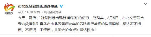 今天,网传“广饶路附近出现新增病例”的信息。经落实,3月5日,市北交警联合专业救援队对青岛市市北区圣康老年护养院进行常规的消毒消杀。请大家不造谣、不信谣、不传谣,共同维护良好的网络秩序!