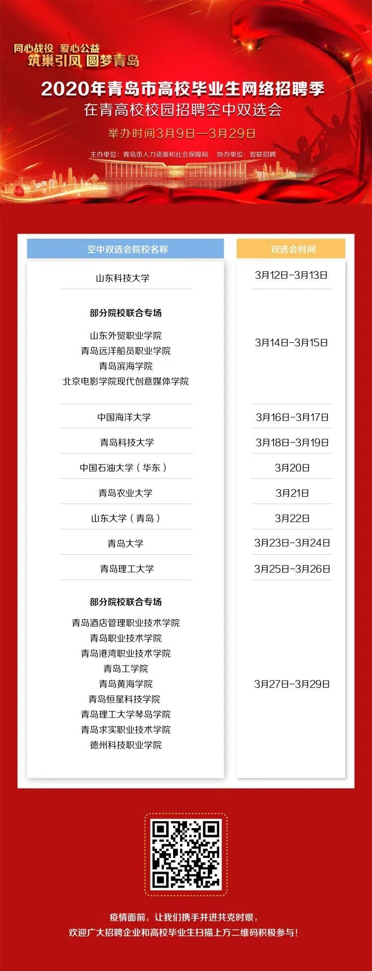 在新冠肺炎疫情防控关键时期,为确保广大毕业生健康安全,满足用人单位招聘需求,以及拓宽高校毕业生求职就业渠道,2020年青岛市高校毕业生网络招聘季在青高校校园招聘空中双选会山东科技大学专场已于3月8日正式开始报名。